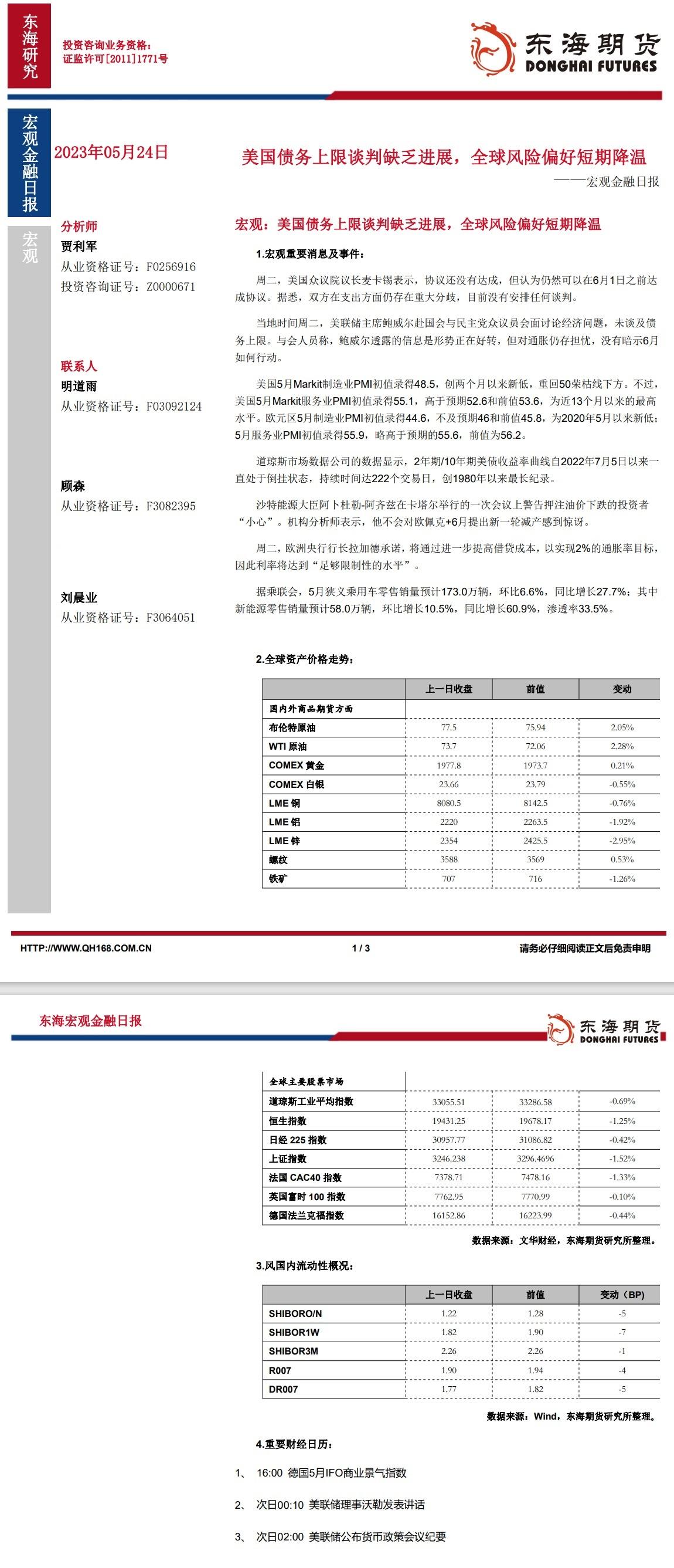 【东海期货5月24日宏观金融日报】:美国债务上限谈判缺乏进展,全球风险偏好短期降温