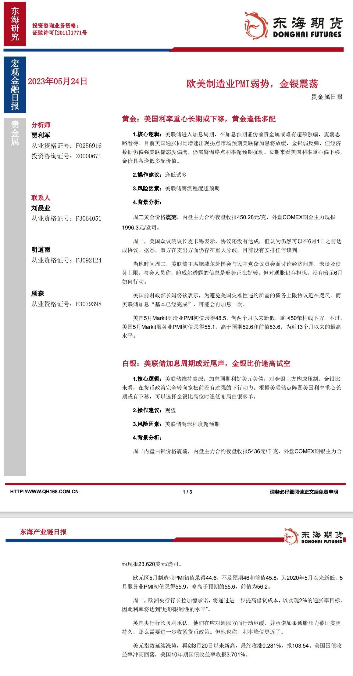 【东海期货5月24日产业链日报】贵金属篇:欧美制造业PMI弱势,金银震荡