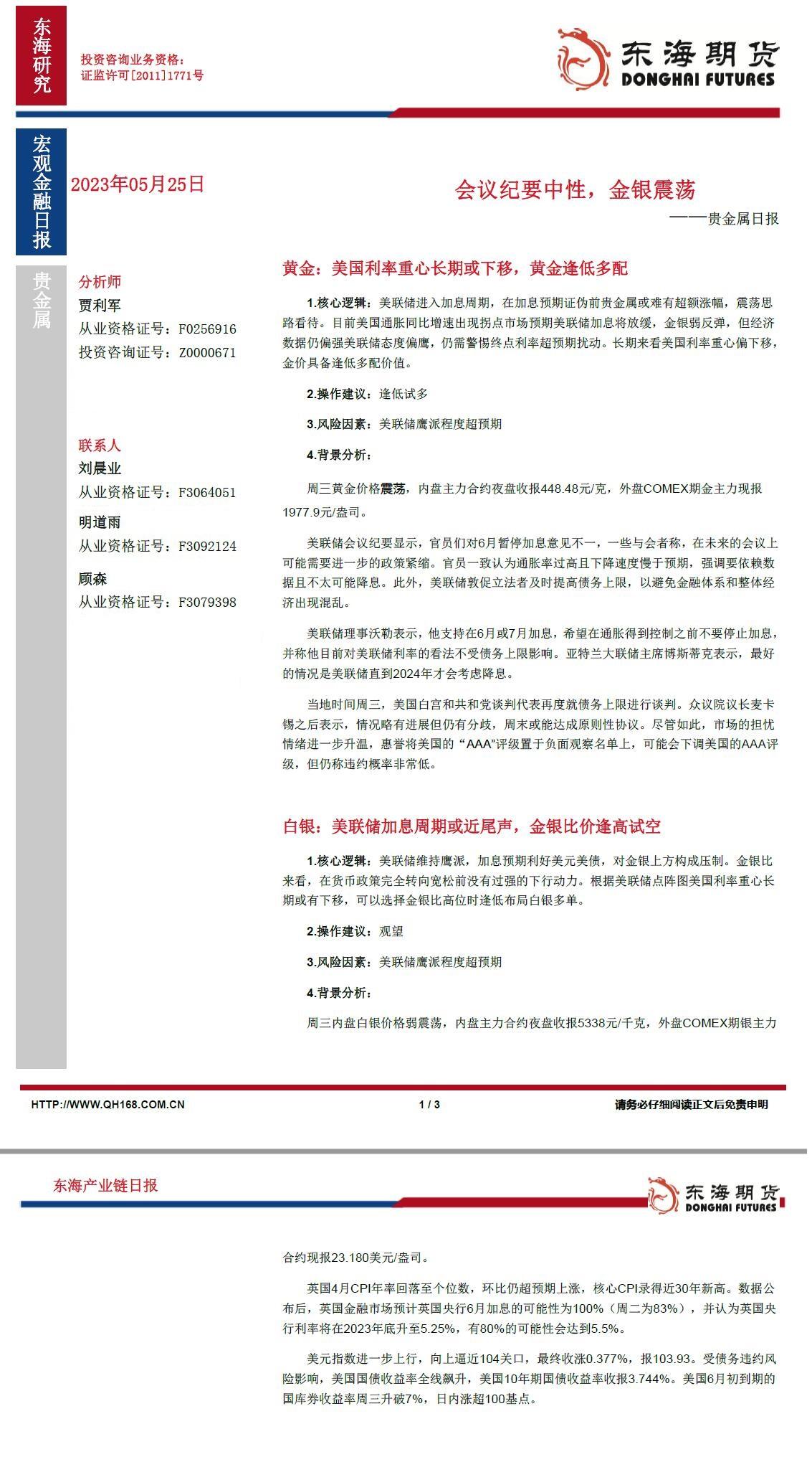 【东海期货5月25日产业链日报】贵金属篇:会议纪要中性,金银震荡