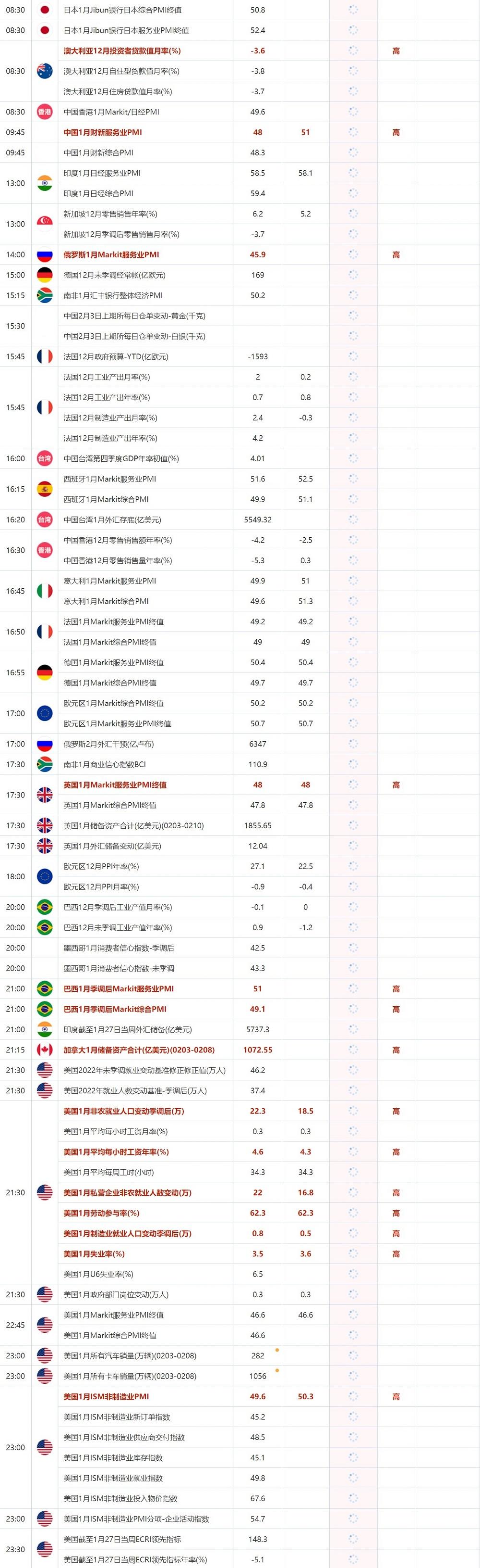 23:00 美国1月ISM非制造业PMI , 前值 49.6 , 预期值 50.3 , 公布值:待发布