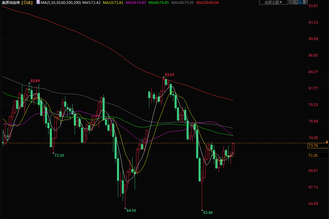 商品收盘情况:美国期金收于1974.50美元,下跌0.1%。布伦特原油期货上涨1.1%,结算价报每桶76.84美元;美国原油期货结算价报每桶72.91美元,上涨1.2%。