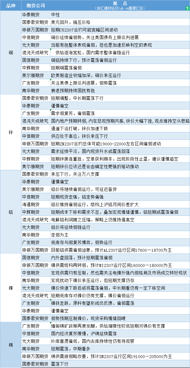 期货公司观点汇总一张图:5月24日有色系(铜、锌、铝、镍、锡等)