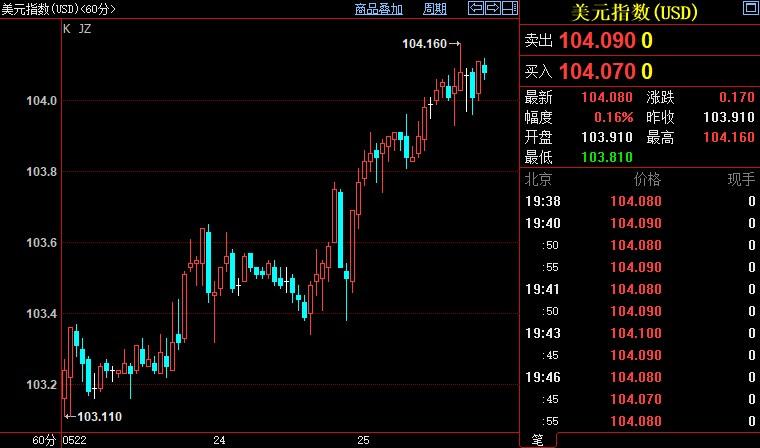 北京时间19:46,现货黄金上浮0.21%至1961.07美元/盎司;COMEX期金主力合约下跌0.14%至1962.0美元/盎司;美元指数上涨0.16%至104.079。