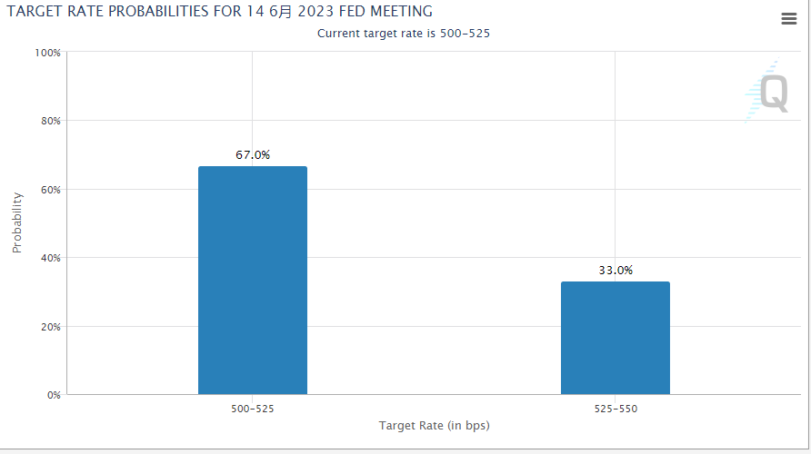 尽管如此,“几乎所有人”也继续看到了通胀的上行风险,一些人认为“有可能”需要进一步加息。CME的“联储观察”工具最新显示,市场预计美联储6月维稳利率的可能性为67%,加息25个基点的可能性为33%。