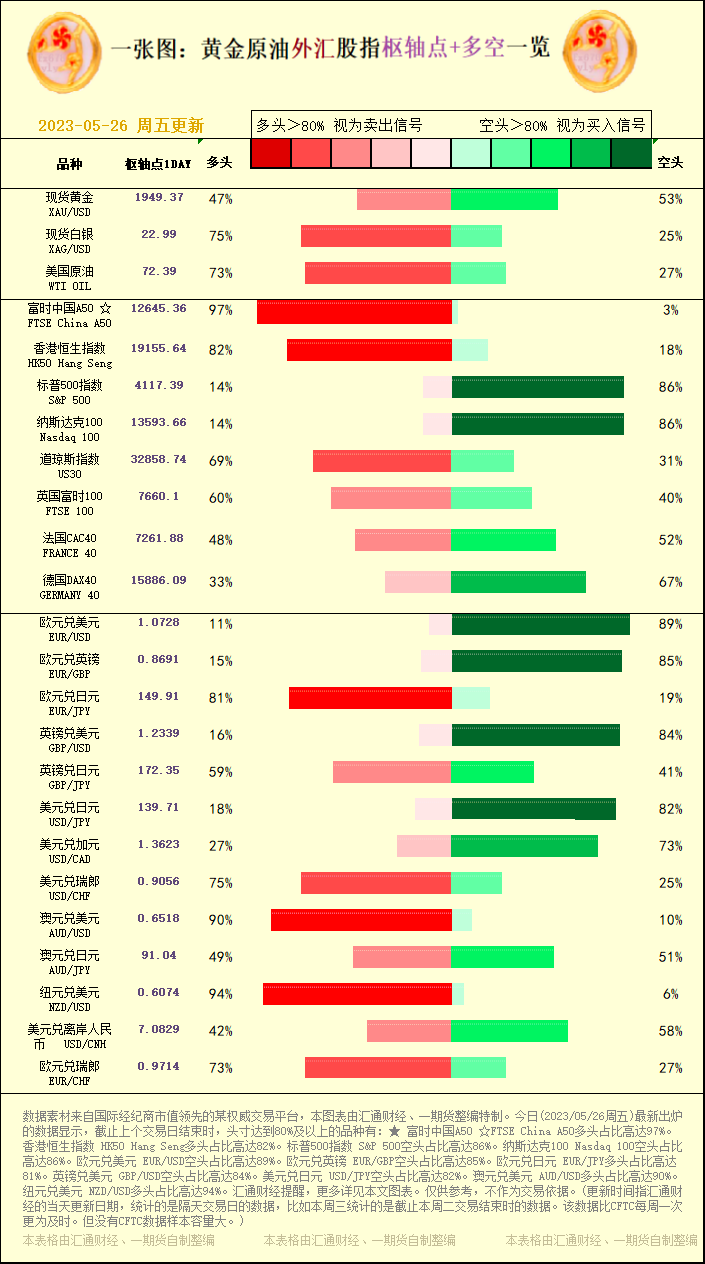 汇通财经APP讯——一张图:黄金原油外汇股指"枢纽点+多空占比"一览。今日(2023/05/26周五)最新出炉的数据显示,截止上个交易日结束时,头寸达到80%及以上的品种有:★ 富时中国A50 ☆FTSE China A50多头占比高达97%。香港