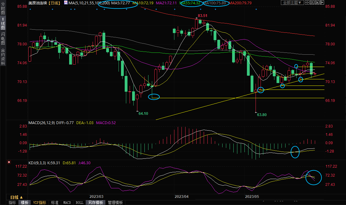 不过,MACD金叉信号仍在,油价仍受到局部上涨趋势线支撑,多头后市仍有一定的机会,初步阻力在5日均线72.77附近,5月19日高点阻力在72.51附近,55日均线阻力在74.32附近,若能强势顶破该阻力,则增加后市看涨信号,进一步阻力参考100日均线75.89附近位置。