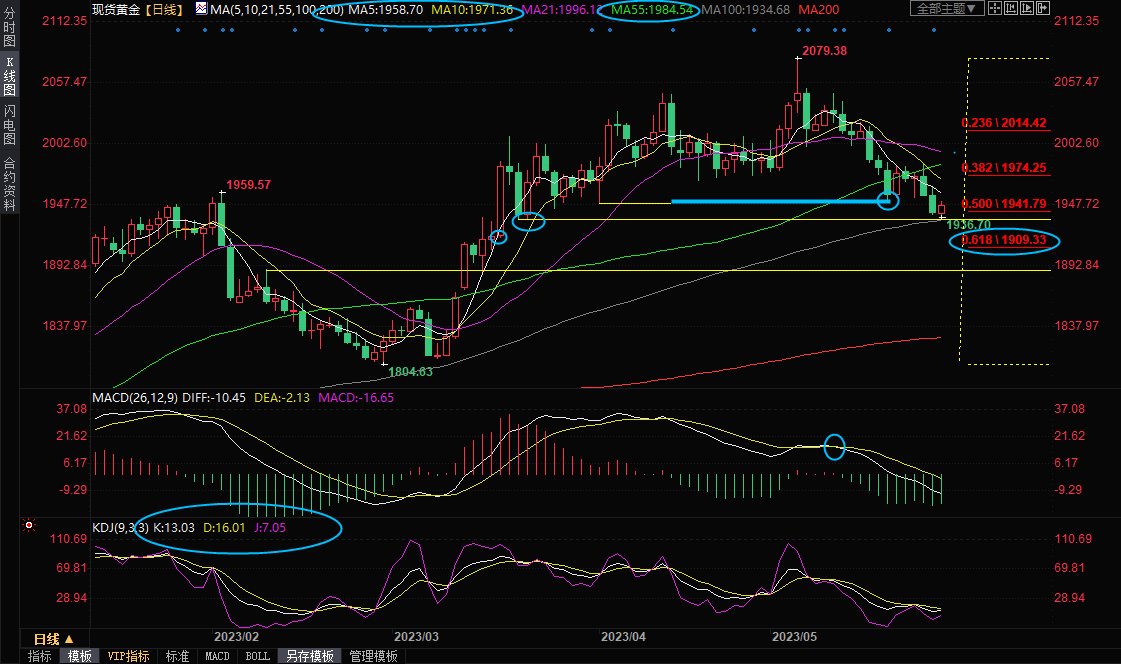 不过,目前金价在100日均线附近获得了一些支撑,该支撑相对较强,KDJ也发出了短线超卖信号,金价短线展开反弹,若能收复5日均线,则削弱后市看空信号。进一步阻力在10日均线1971.46附近,周三高点阻力在1985.13附近(接近55日均线),若意外收复该位置,则增加后市看涨信号。短线的话,5月18日低点1951.87附近也存在一些阻力。