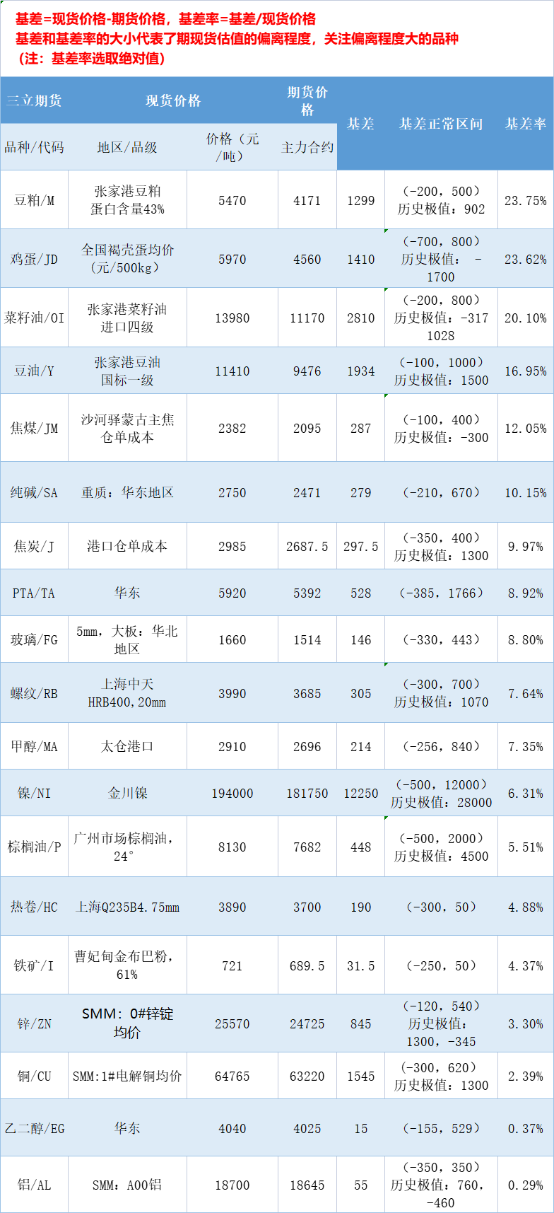 三立期货10月17日基差:一张图尽览有色金属、黑色系、能源化工和农产品基差(按基差率从大到小排序)