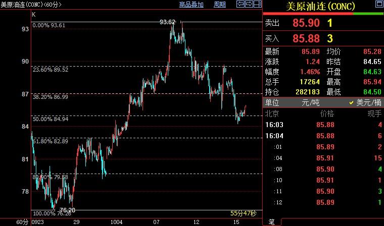 北京时间16:05,NYMEX原油期货上涨1.40%至86.82美元/桶;ICE布伦特原油期货上涨1.40%至92.91美元/桶。