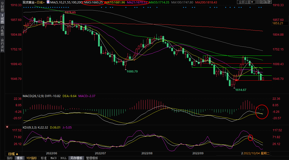 目前1640关口给金价提供支撑,KDJ也接近超卖区域,金价出现了反弹调整走势,上方留意5日均线1660.05附近阻力,若能收复该阻力,则削弱短线看空信号;21日均线阻力在1670.50附近,10日均线阻力在1681.89附近,若意外强势收复该位置,则增加后市看涨信号。