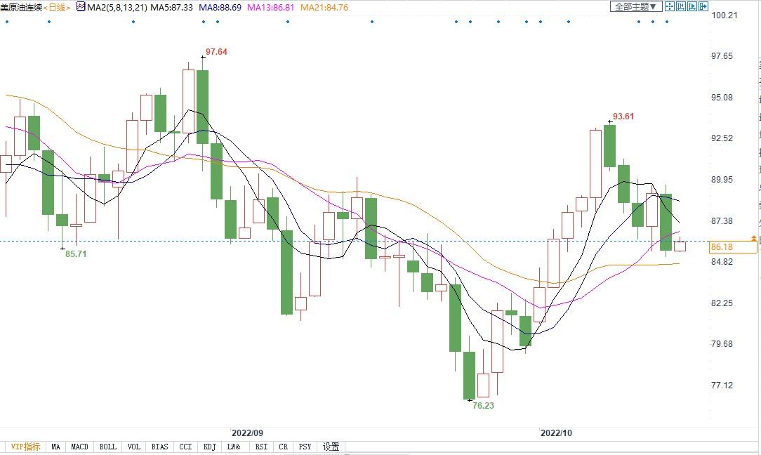 北京时间10月17日13:45,WTI原油主力合约报86.21美元/桶